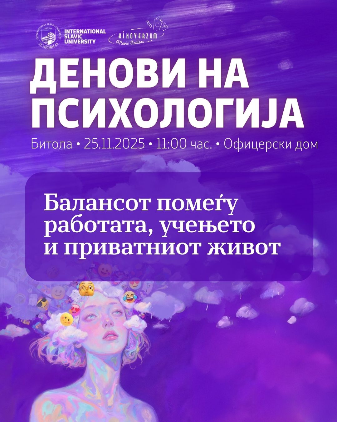 Во време кога секојдневните обврски нè водат во бесконечен круг на стрес и недостиг од време, ќе зборуваме за тоа како да изградиме внатрешен и надворешен баланс. Како да го усогласиме професионалниот, академскиот и личниот живот без да го изгубиме психолошкиот мир?